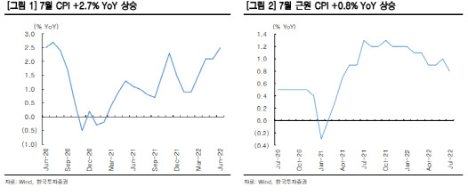 실제 7월 식품 물가는 6.3% 오르며 6월보다 상승률이 높아졌는데 돼지고기와 채소 가격이 상승했기 때문이다. 돼지고기 가격은 과거 모돈 사육량이 줄렀던 영향이 반영됐고 채소 가격은 무더위의 기승으로 올랐다. 반면 비식품 CPI는 1.9% 상승하는데 그쳤는데 근원 CPI 상승률도 전월보다 낮아진 상태다.