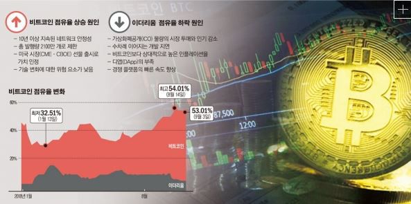 보물창고연초부터 시작된 가상화폐(암호화폐·코인) 하락장이 이어지면서, 비트코인의 점유율이 상승하고 있다. 반면 시가총액 2위인 이더리움과 3위 리플, 4위 비트코인캐시(BCH)의 점유율은 꾸준히 하락 중이다. 불안한 장세 속 대장주인 비트코인이 비교적 안전자산으로 부각하고 있다는 분석이다.