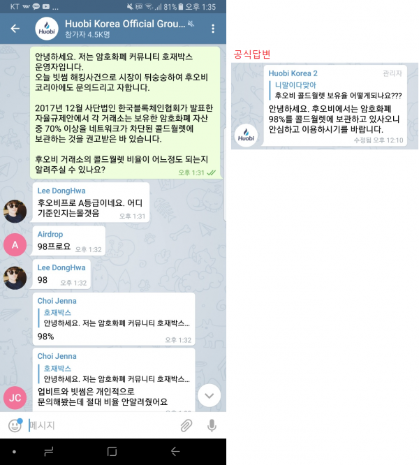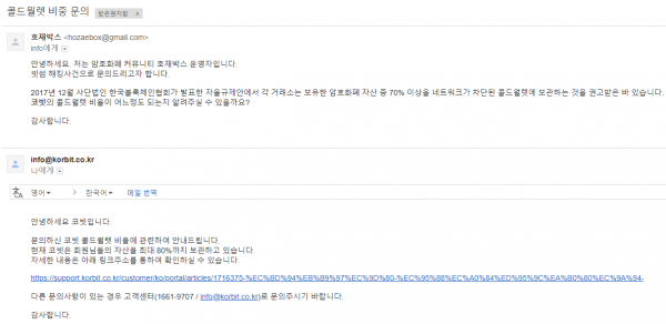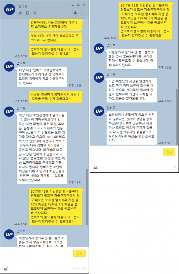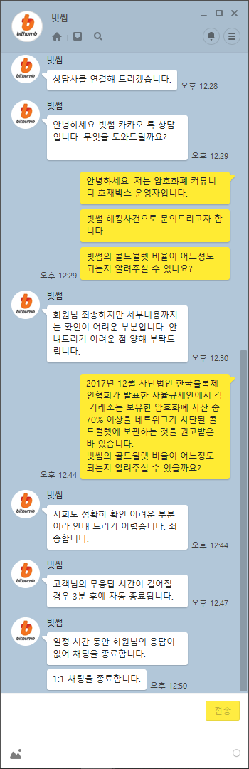 이번 빗썸 해킹사건을 계기로 각 거래소들이 자율규제안을 얼마나 준수하고 있는지 알아보기 위해 각 거래소의 고객센터를 통해 콜드월렛 비율을 문의 해보았습니다.