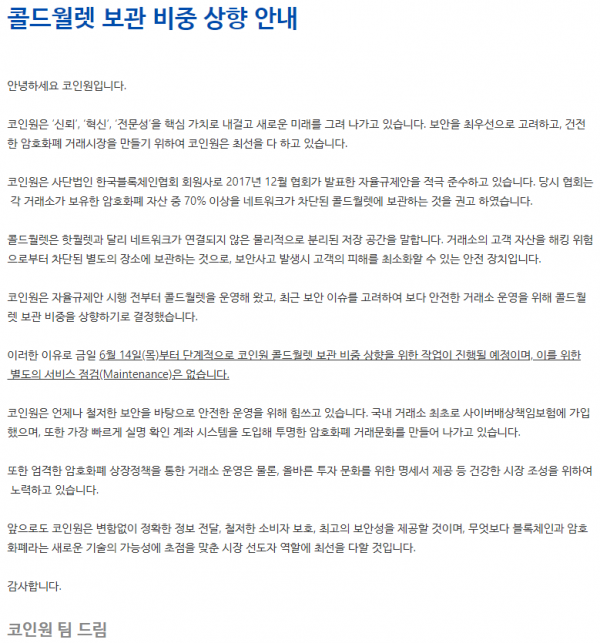 코인원 - “자율규제안 시행 전부터 콜드월렛을 운영”