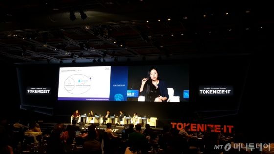 | 10일 서울 용산구 그랜드 하얏트 서울에서 열린 '토크나이즈잇 2018 Fall'에서 하나 장 엘뱅크 대표가 주제 발표를 하고 있다/사진=이재영 인턴기자 |