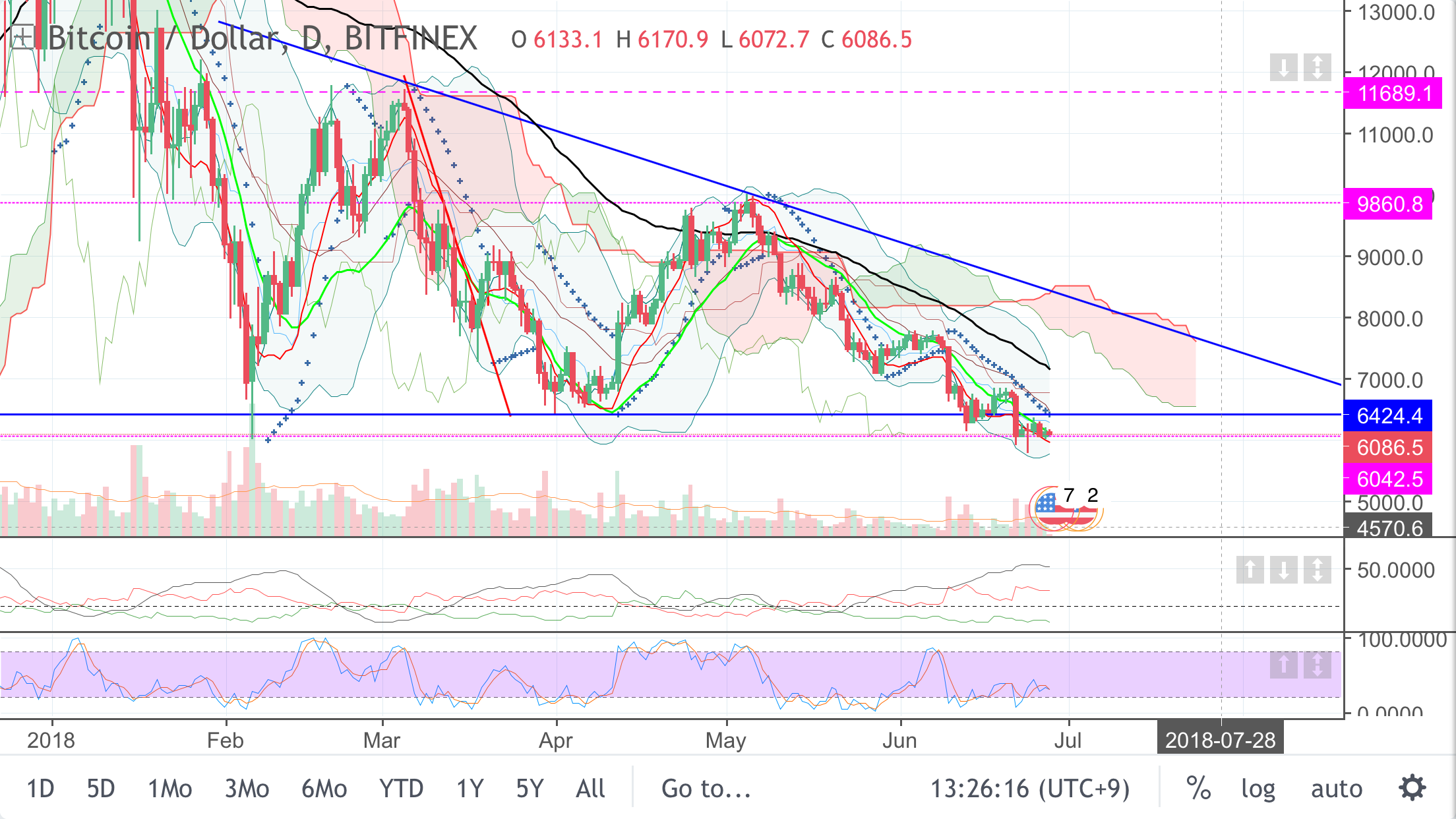 6000달러를 한 번 뚫으면서 지지선 손절을 한 트레이더들에 의한 일시적 하락이 있었습니다. 그러나 변동성이 줄어들면서 6000달러선을 강력하게 하회하려는 움직임은 나오지 않고 있습니다.