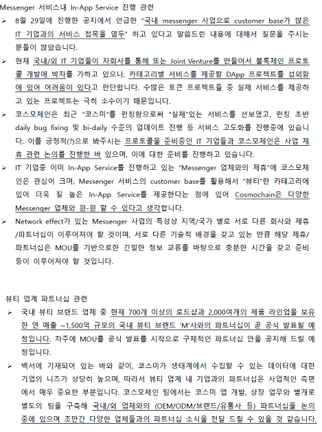 8월 30일과 31일에 오피셜로 뜬 사업계획이야. 국내 메신저사업으로 이용자수가 많은 IT기업과 제휴하려고 한대.