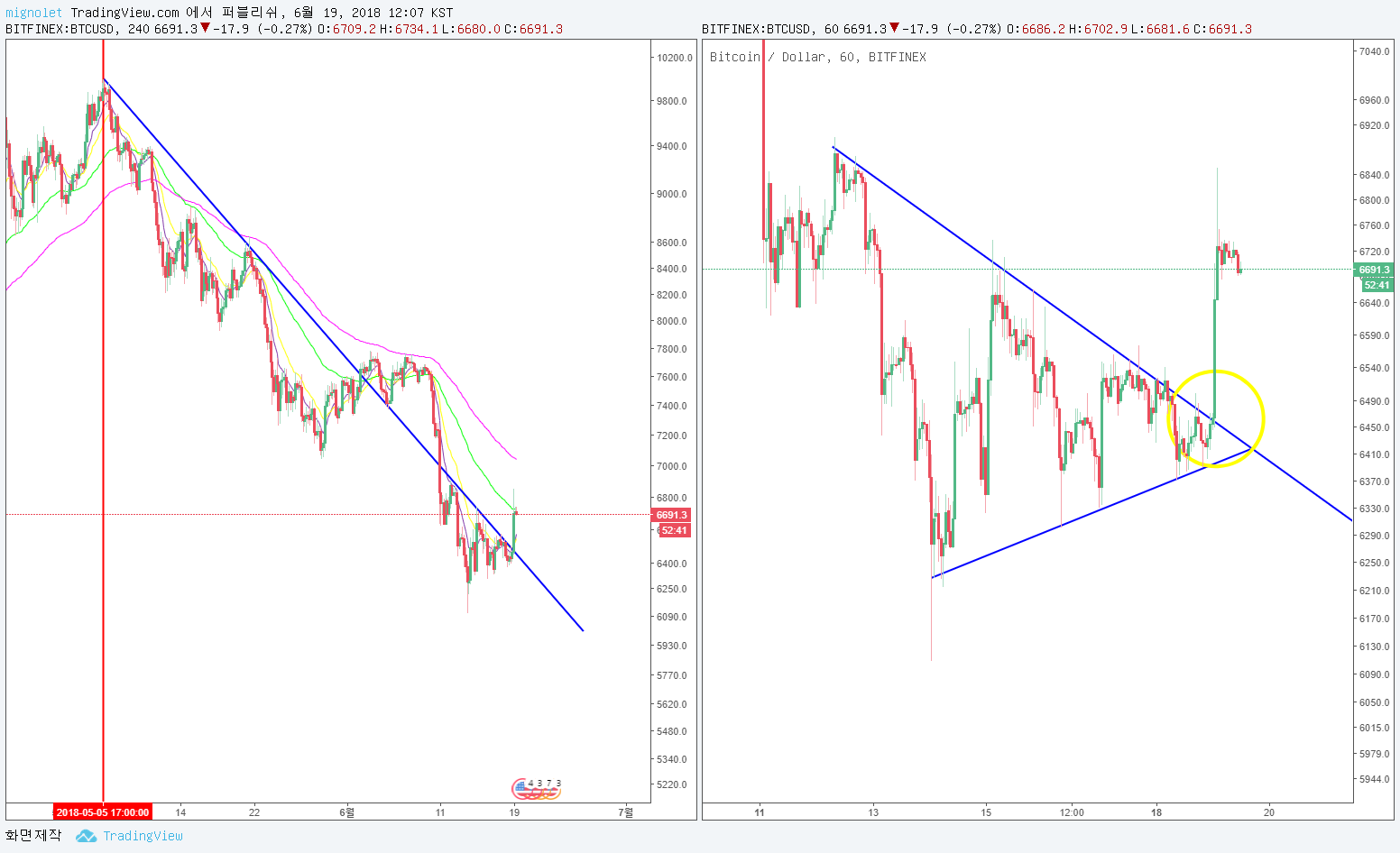 우선은 방향성이 결정됬습니다. 지난분석에서 언급드렸던 삼각수렴과, 5월 부터 시작된 하락추세선을 돌파하는 흐름이 나타났습니다.
