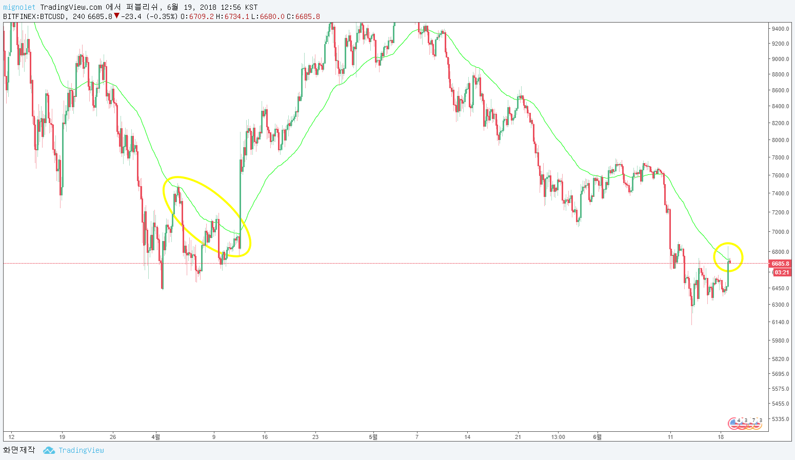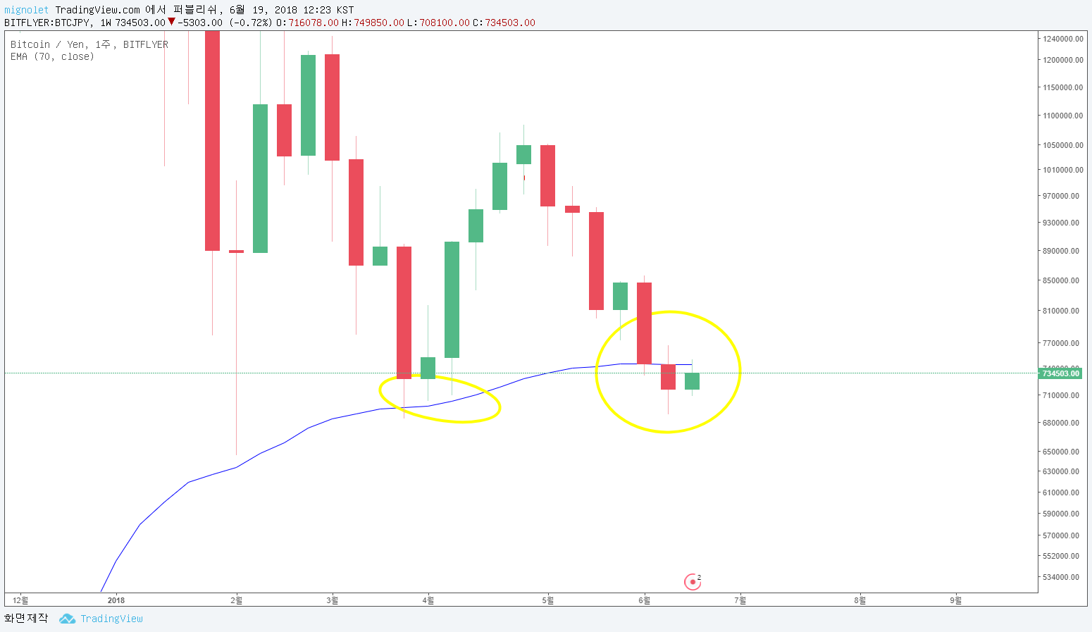 두번째는 비트플라이어 EMA 주봉 70일 이평선의 저항 입니다