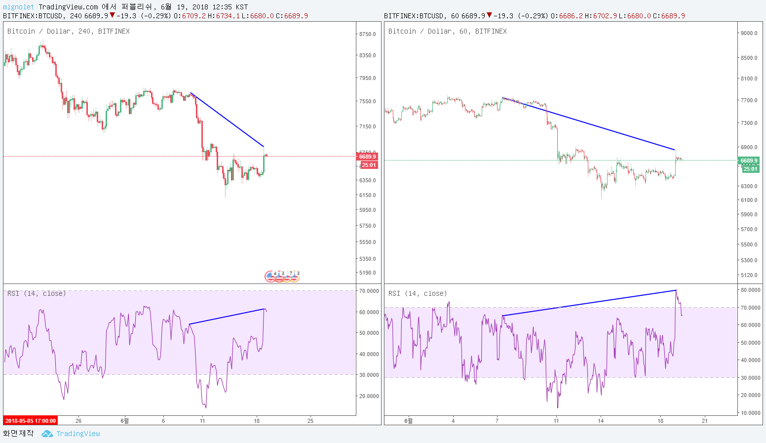 우선 1시간,4시간봉 기준으로 히든하락다이버전스가 나타나고 있습니다.