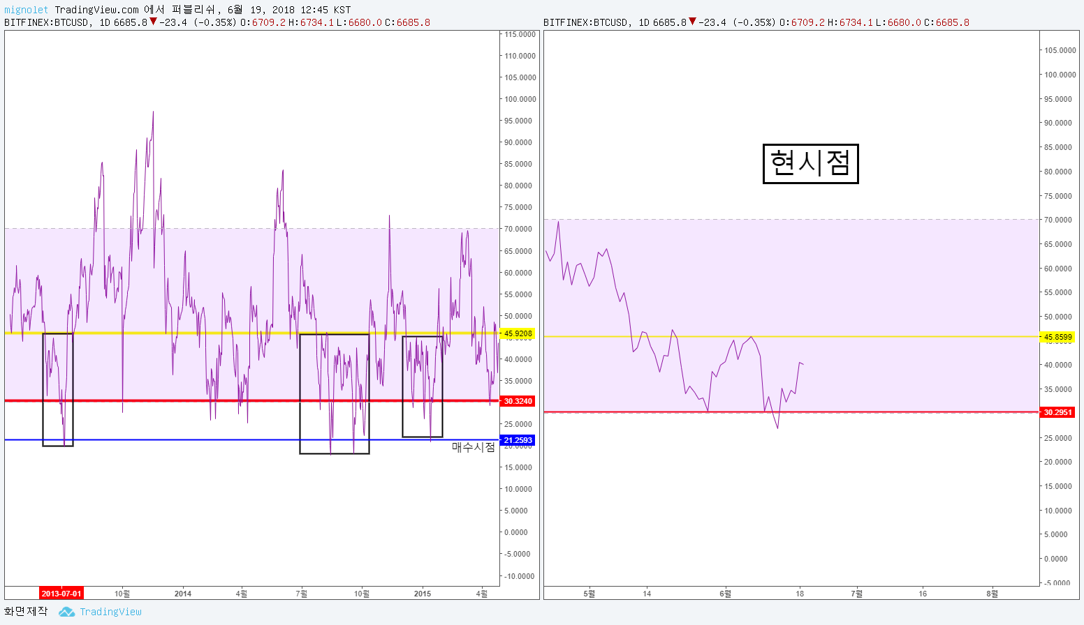 두번째는 제가 6월 13일 역대 비트코인 일봉 RSI 흐름을 통한 분석을 다시한번 언급하도록하겠습니다.