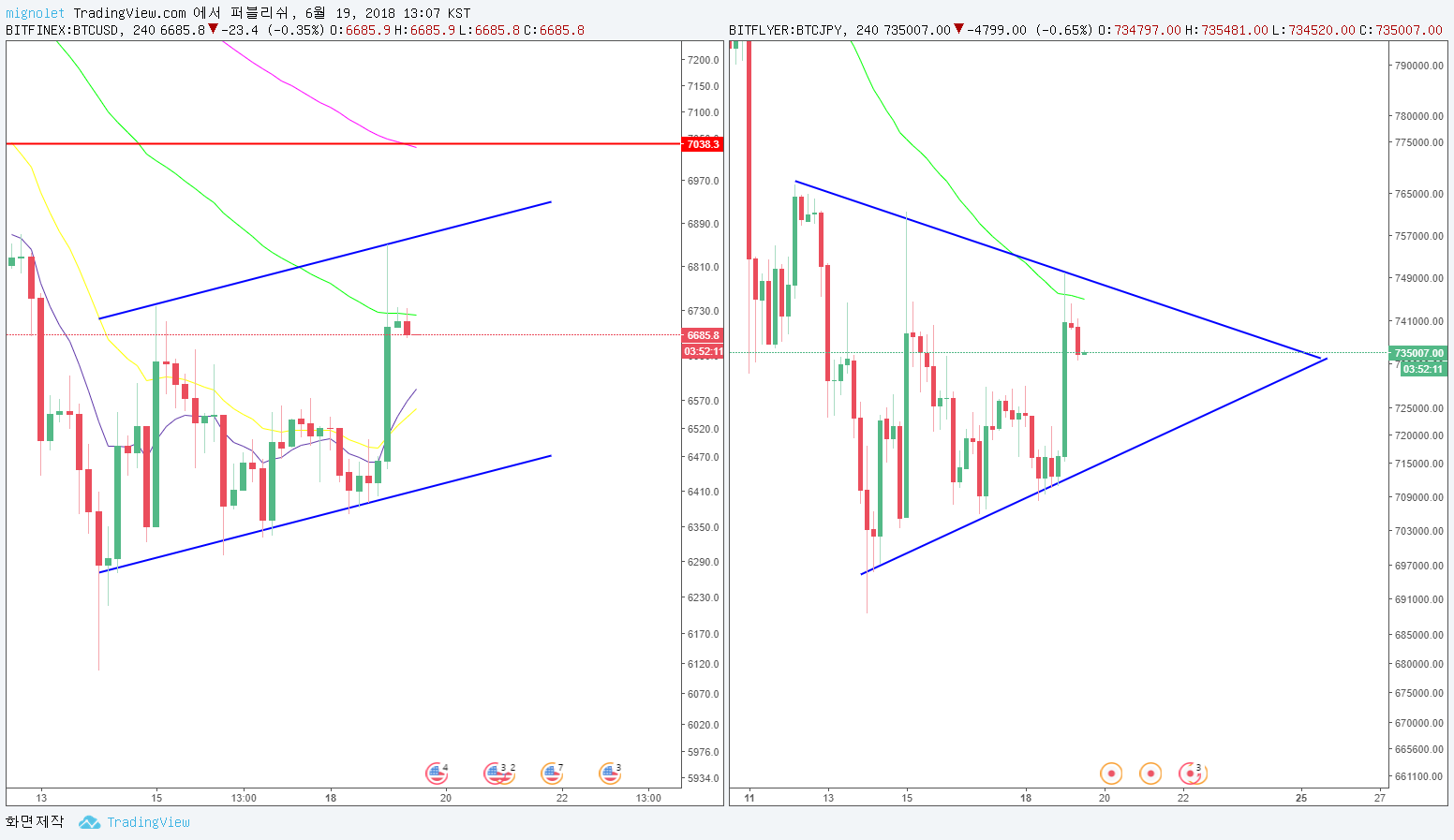 먼저 현시점 비트파이넥스는 상승 평행패턴이 나타나고있으며 비트플라이어는 삼각수렴 패턴의 가능성을 열어두고있습니다.