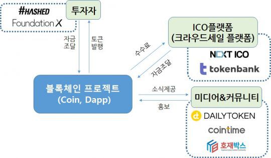 이런 흐름과 더불어 블록체인 프로젝트를 원활히 진행하게끔 이를 지원하고 투자하는 블록체인 전문 액셀러레이터, 마케팅 자문 업체, 암호 화폐 공개(Initial Coin Offering, ICO) 플랫폼 등이 생겨난다. 나아가 일반 사용자가 거래소에 상장된 코인을 더 쉽게 활용하도록 여러 유틸리티 서비스도 개발된다.