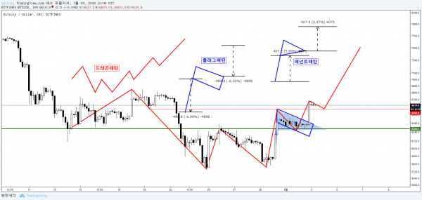 위차트에서 보시다싶이 패넌트,플래그 삼각수렴 또는 쌍바닥 ,더크게 드래곤패턴이 있습니다